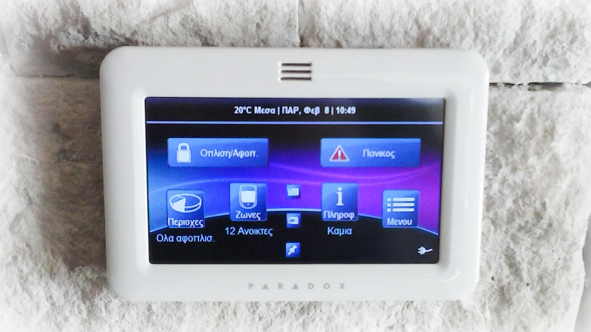 Για τον τοπικό χειρισμό του συστήματος εγκαταστάθηκαν πληκτρολόγια Touch Screen, νέας σχεδίασης, με απεικόνιση ζωνών και ελληνικό menu, καθώς επίσης και αντιβανδαλιστικές εξωτερικές και εσωτερικές σειρήνες για ειδοποίηση σε περίπτωση συμβάντος.